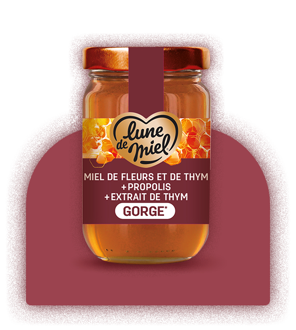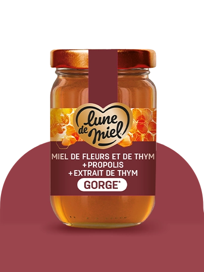 Dans cette préparation Gorge* Lune de Miel®, la propolis s’associe à l’extrait de thym et au miel pour offrir une sensation douce et réconfortante en bouche.