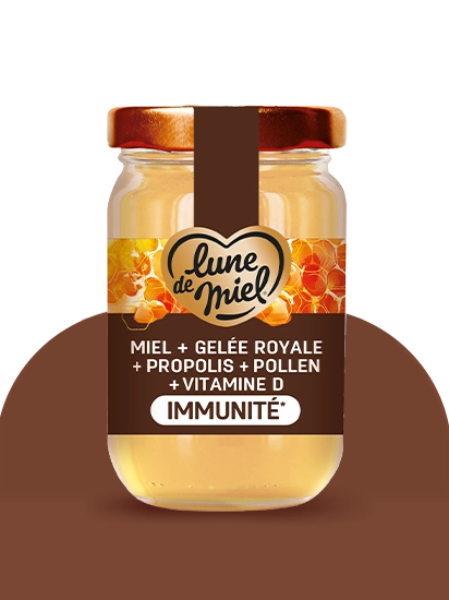 Dans cette préparation Immunité* Lune de Miel®, les quatre trésors de la ruche élaborés naturellement par les abeilles sont réunis : le miel, la gelée royale, la propolis et le pollen. La vitamine D, également présente dans cette préparation, contribue au fonctionnement normal du système immunitaire.
