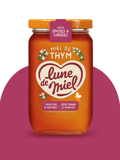 Le miel de thym Lune de Miel® se reconnaît à son goût plus intense que les autres miels. Il offre des saveurs chaudes et légèrement épicées, qui apportent du caractère aux recettes du quotidien.